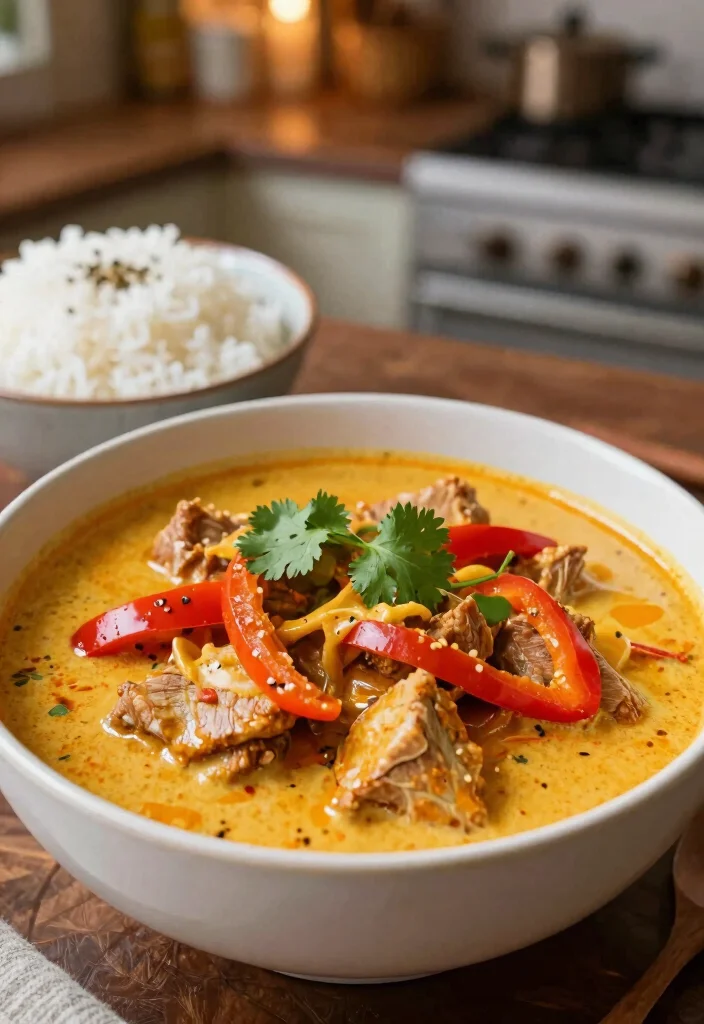 Ready for a flavor adventure? This Thai red curry pork stew brings vibrant tastes to your dinner table. The creamy coconut milk combined with red curry paste creates an aromatic dish that’s irresistibly delicious while keeping you warm during the colder months.Packed with flavor and spice, it’s a delightful way to enjoy a taste of Southeast Asia right at home.