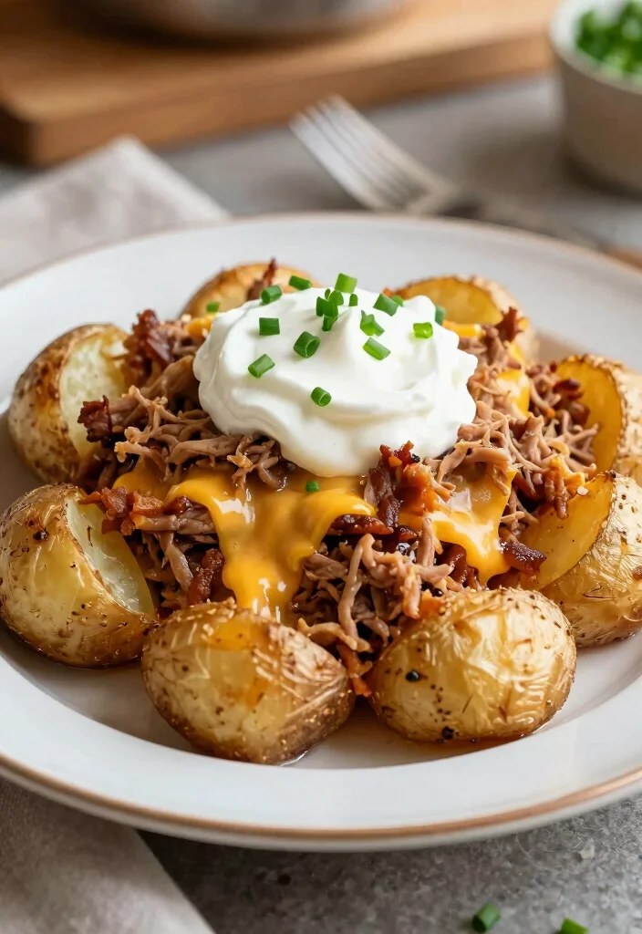 Loaded baked potatoes are a comfort food classic, especially when topped with pulled pork! Crispy on the outside and fluffy on the inside, these potatoes are perfect for a filling meal. Just add your pulled pork, cheese, and sour cream for a delicious twist that’s sure to please.