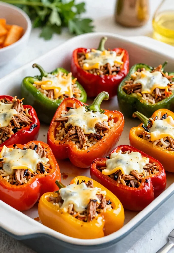 Want 5-star flavor from leftovers? Pulled pork leftover recipes don’t have to be boring—the peppers stuffed with pork and rice bake into a colorful, weeknight winner. It’s easy, budget-friendly, and ready in one pan.